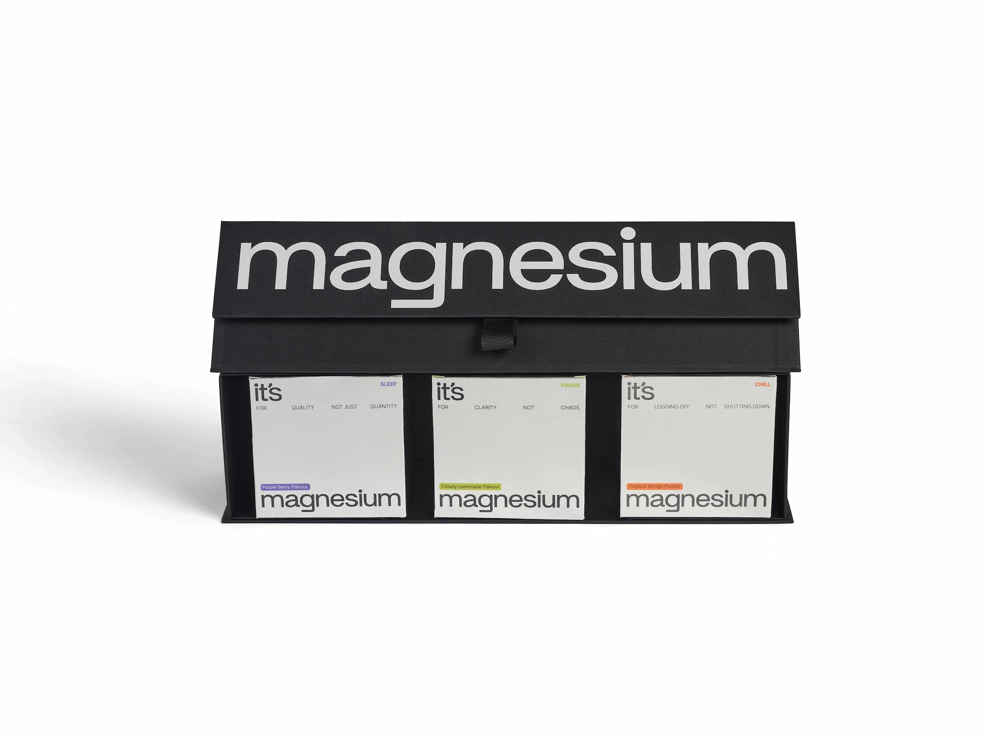 The MAGNESIUM BLACK BOX is designed to hold your functional magnesium products – CHILL, FOCUS, and SLEEP. Whether you're gifting someone their first taste of it'smagnesium or keeping your own supply organised and stocked, the BLACK BOX has you covered. Gift it once, then keep it stocked.